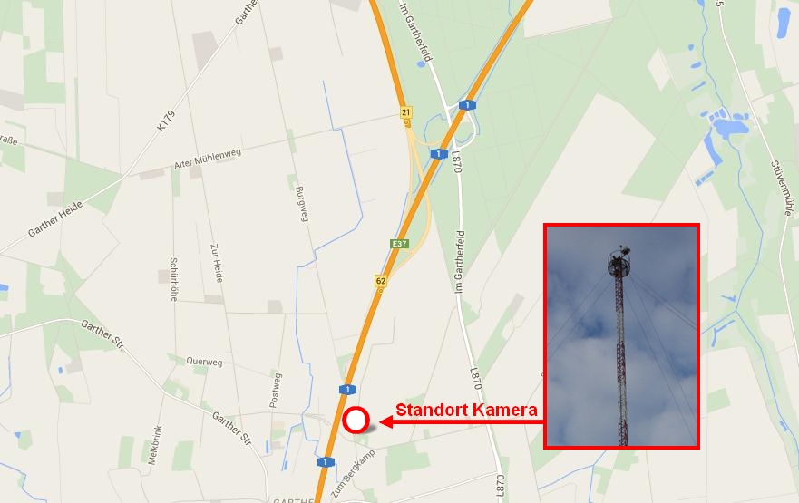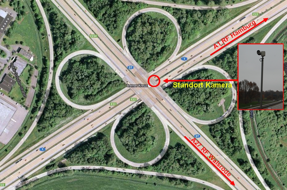 Die Anlage dient ausschließlich der Überwachung der Verkehrsströme bzw. der Verkehrsbelastungen auf den Bundesautobahnen 1 und 27 in allen Richtungen, um frühzeitig Staus und Behinderungen zu erkennen und darauf reagieren zu können. In der beigefügten Zeichnung ist der neue und derzeitige Standort der Kameraanlage zu sehen. Die Kamera ist 340° schwenkbar, so dass alle Richtungen der BAB 1 sowie 27 eingesehen werden können. Zudem kann die Kamera auch geneigt sowie das Bild auch herangezoomt werden. Dabei sind aber weder konkret Personen erkennbar noch Kennzeichen lesbar. Es erfolgt keine Aufzeichnung der Aufnahmen, sondern lediglich eine Live-Übertragung auf die Wache des ESD BAB Langwedel.